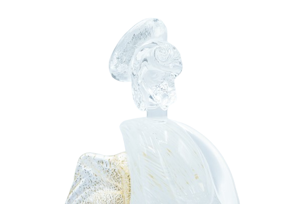 Scultura in vetro raffigurante un angelo con dettagli in foglia d’oro.