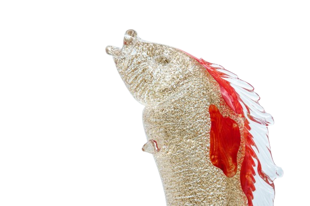 Scultura in vetro massiccio pezzo unico con decoro oro w dettarli in vetro rosso a macchie. Scultura in stile classico le texture del corpo ricordano le scaglieĀ del pesce creano un contrasto con i dettagli rossi.