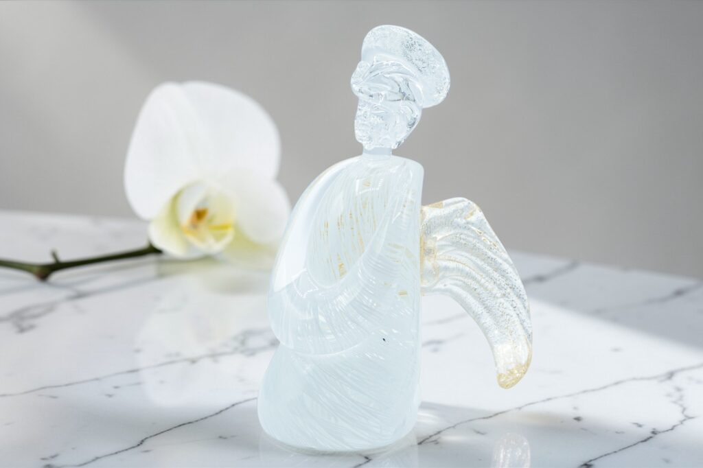 Scultata pezzo unico base color ambra trasparente realizzata con la tecnica delle macchie di colore.Vaso pezzo unico in vetro soffiato con motivi a spirale e fasce di colori che creano uno stile vivace e pittorico. La base color nero crea un contrasto con le pennellate di colore create dal maestro nei toni del rosso giallo arancio e bianco.l collo lungo e le zampe sottili creano un contrasto con il corpo massiccio cerando un equilibrio tra forma naturale e interpretazione artistica.