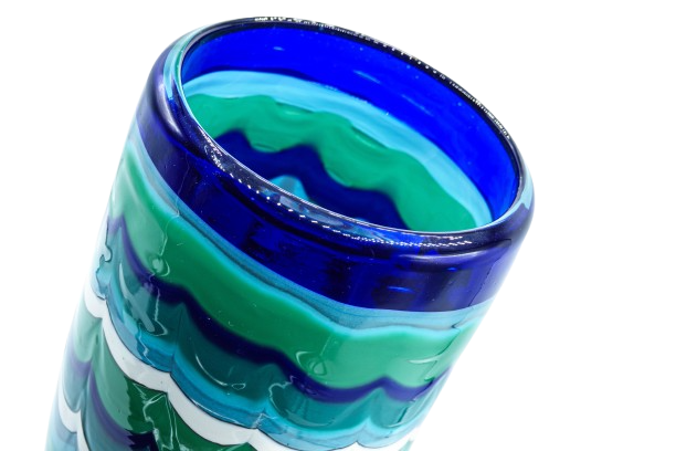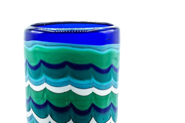 Vaso pezzo unico in vetro soffiato con motivi a onde e fasce di colori che creano uno stile vivace e pittorico. La base color blu crea un contrasto con le pennellate di colore create dal maestro nei toni del verde, azzurro e bianco.
