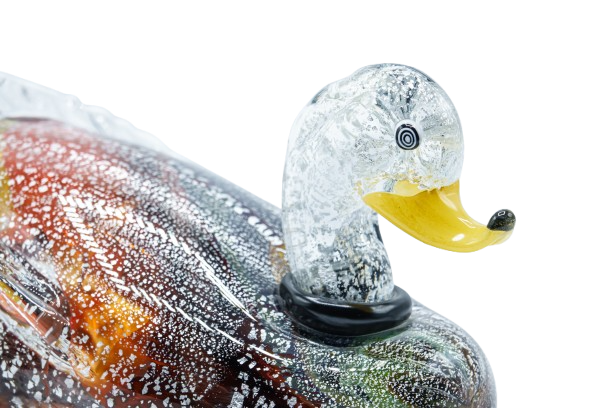 Scultura in vtero soffiato pezzo unico. Il corpo è creato con un mix di colore per replicare la varietà di colori del piumaggio decorato con foglia d’argento in contrasto con la testa in vetro trasparente e foglia d’argento che dona leggerezza all’oggetto.