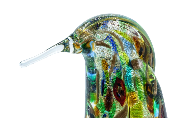 Scultura in vero massiccio con base vetro con decoro argento sulla quale sono state fuse delle murrine policrome von iserti in avventurina per creare dei riflessi di colore.