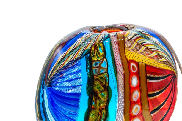 Round vase made with the sommerso technique, crafted with colored canes and murrine.